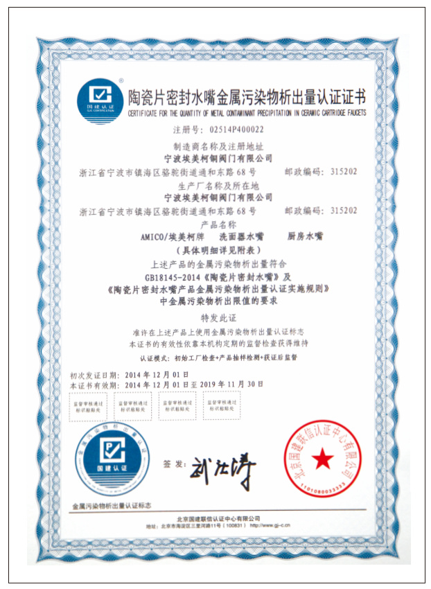 陶瓷片密封水嘴金属污染物析出量认证证书